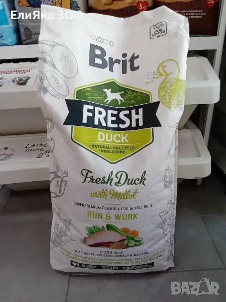 1. Brit FRESH Duck wath Millet Adult Run&Work високо протеинова храна за пораснали кучета от всички породи с активен начин на живот. С пряно и сушено патешко месо, тиквички и спанак 12 кг. Цена 113 лв.
