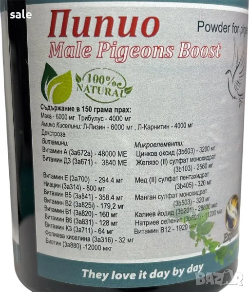 Приложение: Като добавка продукта Pipio Male Pigeons Boost-150 гр.прах е предназначен подпомага половата активност при мъжките птици.