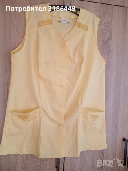 Предлагам дамска къса престилка без ръкави.Ширина от мишница до мишница 60см.Дължина 87см. Платът е смес от памук и полиестер.Цветът е млечно жълт,топъл и приятен.