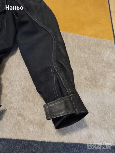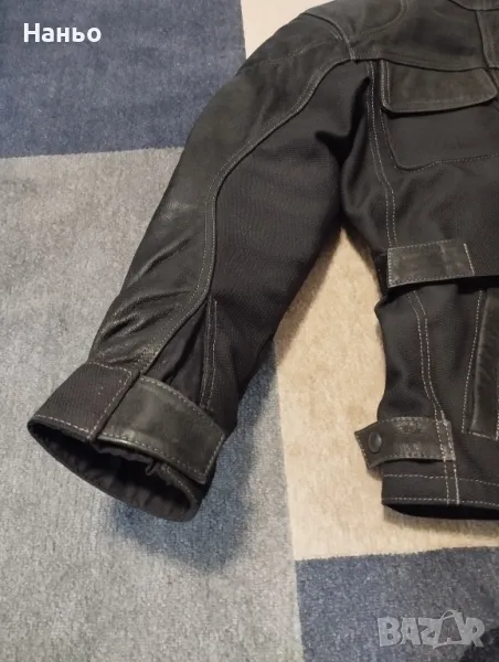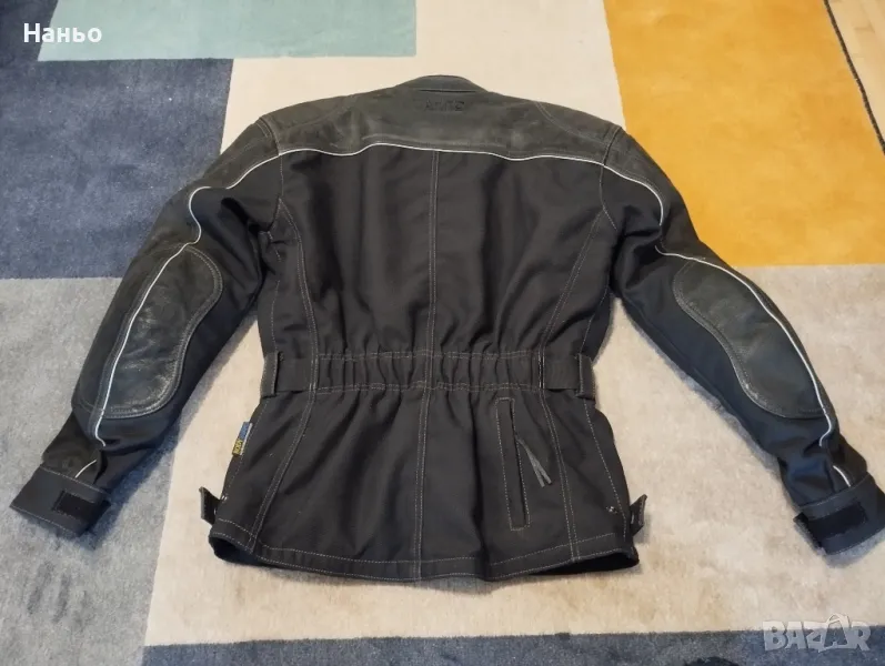 Яке от текстил и кожа,с протектори на рамена,лакти и гръб!Джобове с ципове,има и цип за захващане към панталон.Размер-S.Здраво без скъсано или протрито.