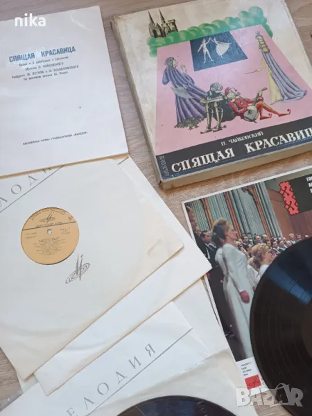Включва кутия от 4 плочи и книжка с музиката на Чайковски от балета Спящата красавица. Кутията не е в перфектно състояние, но плочите са нови.
