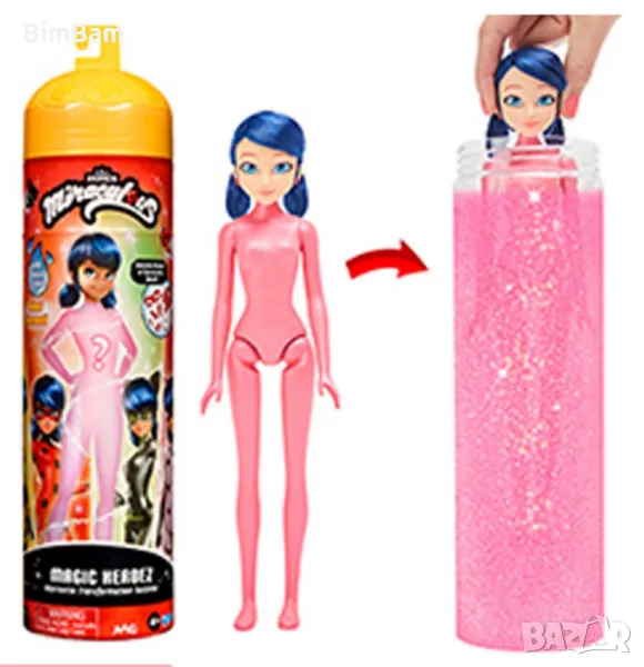 Изживей магията с тази кукла, с магическа трансформация. Само с малко вода, ще помогнеш на Маринет да се трансформира в един от нейните геройски костюми и да разкрие аксесоарите си.