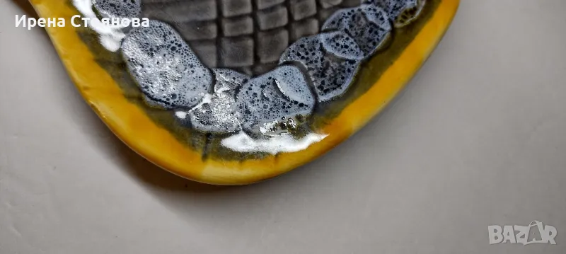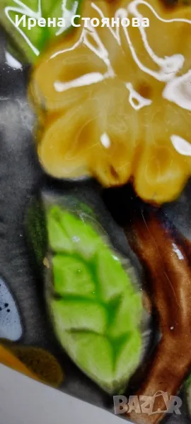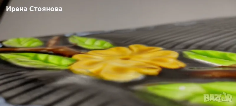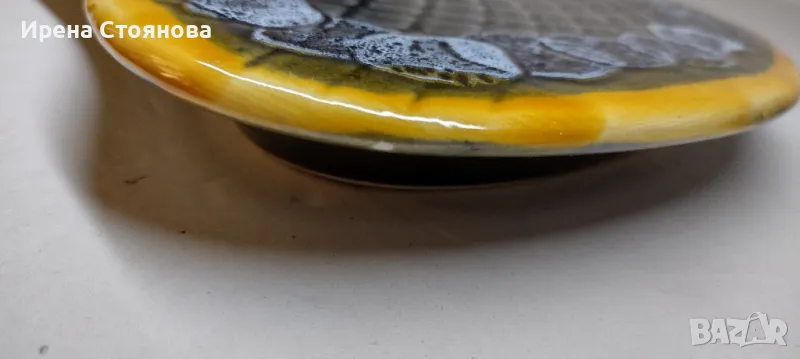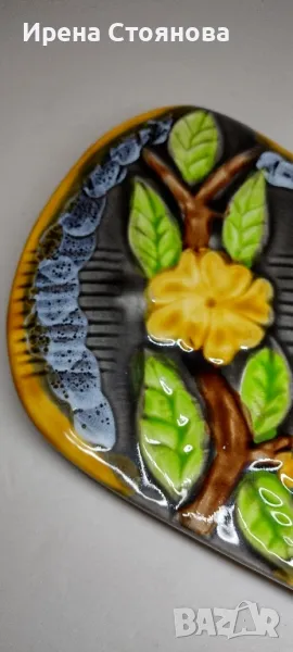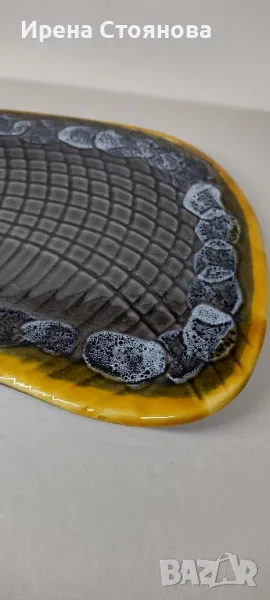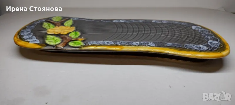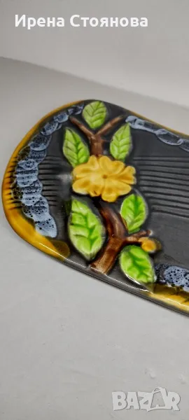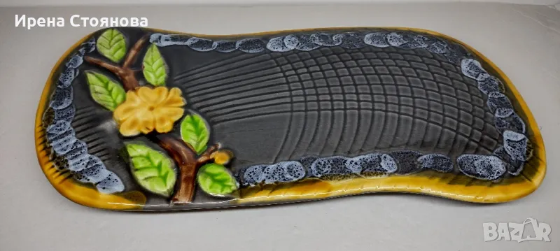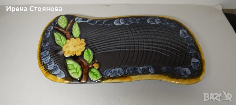 Винтидж керамично плато за сервиране или декорация Vallauris, Франция. Предполагам период около 1960-1960 г.Наситени, ярки цветове в съчетание с релефна декорация и блясък. Размери в най- широки части 38,5/18,5 см и височина 2,5 см. Почти незабележими следи от употреба/ съхранение. На две места има малки забележки, като точки една в едното листенце и една на ръба, която остава отдолу и не се забелязва. Цена 75 лв.Сгушен в живописния регион Прованс-Алпи-Лазурен бряг в югоизточна Франция, се намира очарователният град Vallauris, спечелил репутацията на убежище както за любителите на керамиката, известна със своята изящна изработка и богата история.Грънчарската традиция на Vallauris може да бъде проследена повече от две хиляди години до римската окупация на региона. През това време Vallauris е известен с производството на утилитарна керамика като амфори, буркани за съхранение и плочки. Керамиката на Vallauris спечели международно признание и признание през 20-ти век, до голяма степен благодарение на група талантливи художници и грънчари, които създадоха своите ателиета в града. Сред тях беше известният художник Пабло Пикасо, който изигра ключова роля в извеждането на керамиката на Vallauris в светлината на прожекторите.Грънчарството на Vallauris обхваща широка гама от техники и стилове, правейки завладяващата керамика, която обичаме. Една от отличителните черти на керамиката Vallauris е нейната жизнена и цветна глазура, която винаги ни привлича! Занаятчиите често експериментират със смели и нетрадиционни цветови палитри, което води до керамика, която е едновременно визуално поразителна и нетрадиционна. Керамиката на Vallauris обхваща широка гама от предмети, от функционални предмети до декоративно изкуство. Някои от най-популярните керамични предмети на Vallauris включват чинии, чаши и подноси, вази и кани, скулптурни предмети, стенни плочки и стенописи.