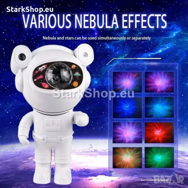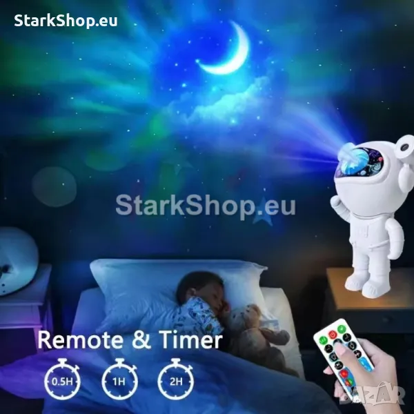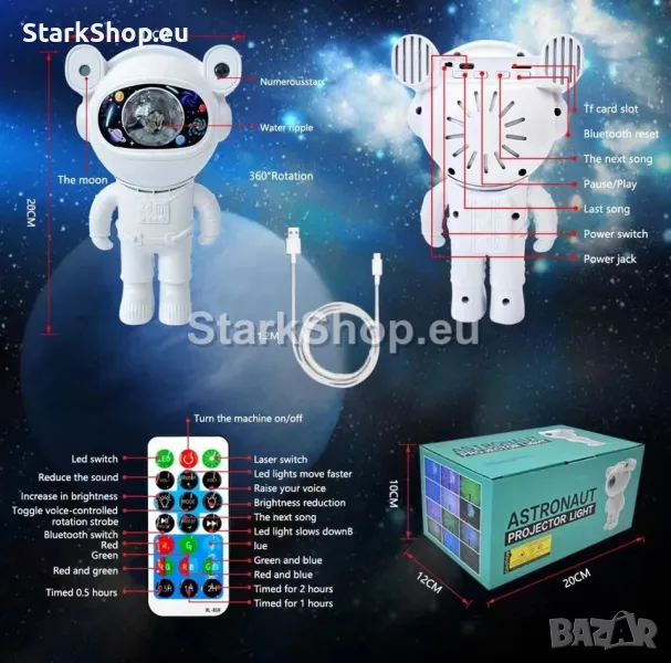 Тази детска нощна лампа проектор изглежда като астронавт, а главата на астронавта е свързана с магнит към тялото за лесно регулиране на ъгъла на проекция на зведното небе. Светлинните ефекти се проектират върху стените и тавана, създавайки реалистично звездно нощно небе, осигурявайки релаксираща и комфортна атмосфера и карайки ви да се чувствате като на разходка сред звездите. Допълнителна атракция е възможността за възпроизвеждане на музика от телефона чрез Bluetooth.