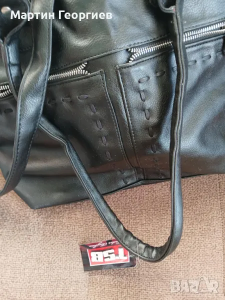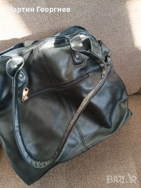 Нова с етикет.Голяма с три големи джоба с ципове.С два малки с цип отпред и един с цип отзад.С два малки вътрешни с цип и без цип.Широка около 30 м.Висока около 30 см.Дълбока около 15 см. Има и дълга дръжка.От естествена мека кожа.Българско производство-виж етикета.