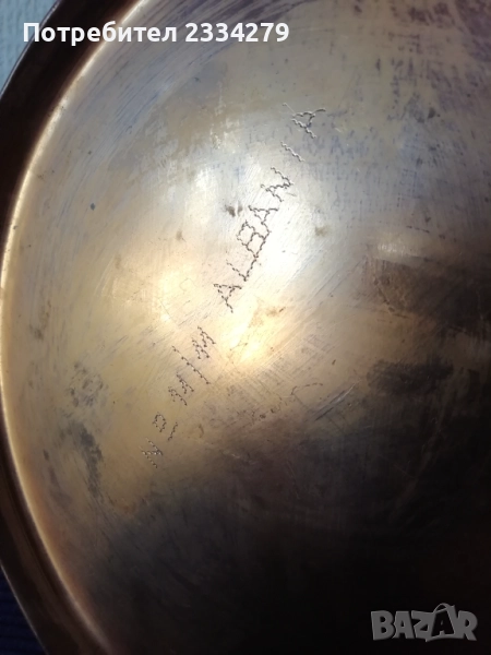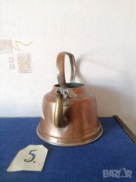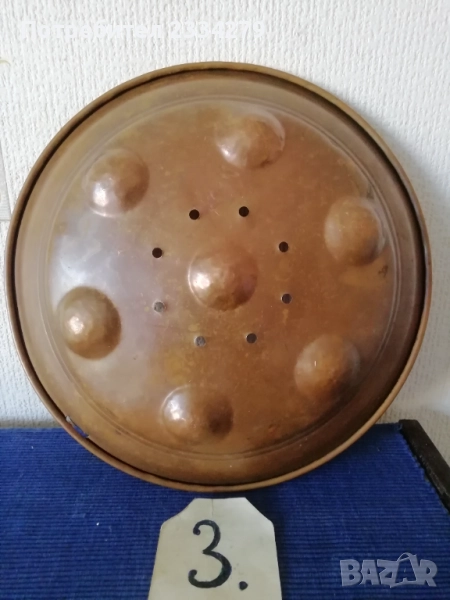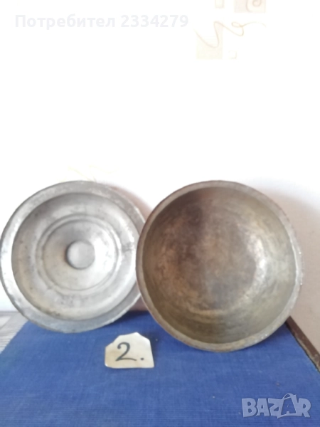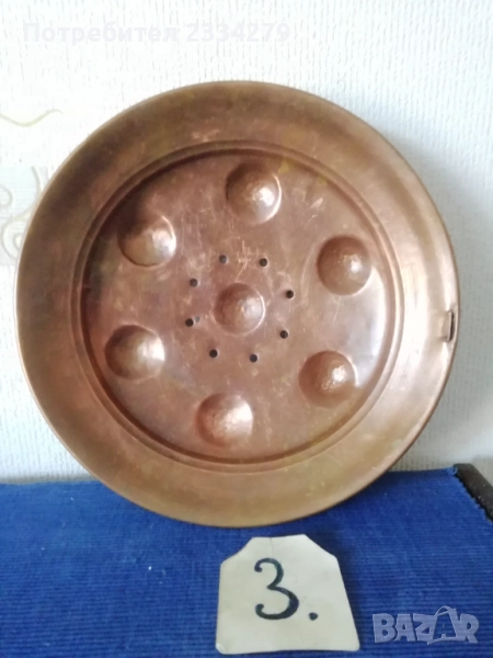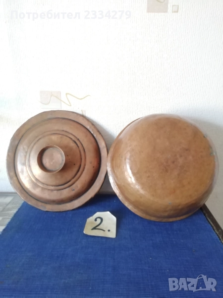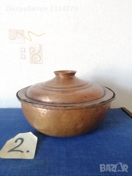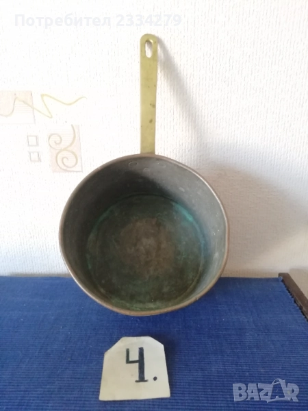 N:2 ; стара гръцка медна ръчно кована тенджера с капак, размери: широчина 27см.,дълбочина 10см., вместимост 3л.500гр., тегло 1кг., цена 37€. (има наковани инициали на капака и на тенджерата) ; N:3 стар гевгир цедка за яйца и кнедлики, медна изработка с размери 30х7см., цена 13€.; N:4 медна тенджера-кастрол с бронзова дръжка, размери: широчина 20см.,дълбока 13см., вместимост 2л.700гр., тегло 900 грама, цена 23€.; N:5 меден чайник с размери 24х25см.,тежи 1кг., цена 21€; N:6 меден букал, халба за вино бира и други, размер 11х11см., цена 7€.