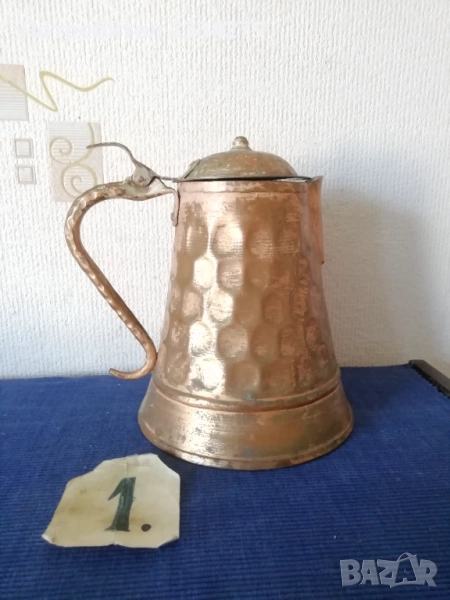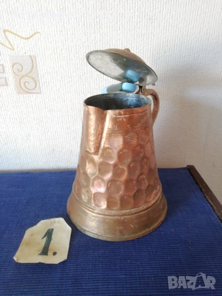 медни съдове, използвани в бита на гръцка къща. N:1 голяма кана с капак, ръчна медна изработка от Албания, размери 24х20см., тежи 900гр., цена 23€.; Стар чайник от мед и месинг с размери: 21х17см. вместимост 3л. 500гр., тегло 1кг., цена 25€.;