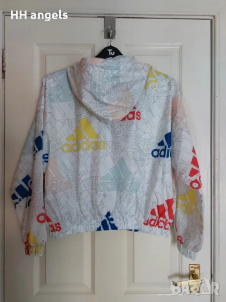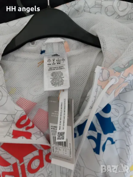 Adidas уникална цветна ветровка( с мрежеста подплага ) и качулка.Самото моделче е по-късо,а уширено на гръдна обиколка,с ластик на кръстта.С етикети,модел:HL4465 и е с дължина 58 и гръдна обиколка 128 см.Спокойно би станала за М,Л,ХЛ размер.