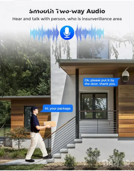 - 【Моторизирано 360° панорамно 90° накланяне и водоустойчивост IP66】Вертикално 90° и хоризонтално въртене 360°, като по този начин намаляват слепите петна на зрението, дистанционно управление на камерата нагоре, надолу, наляво и надясно въртене по всяко време и навсякъде на мобилния телефон. IP66 водоустойчив и прахоустойчив, използва висококачествени материали, лесно издържа на лошото време, може да работи от -20°C до 50°C. Най-добрият избор за външно наблюдение.