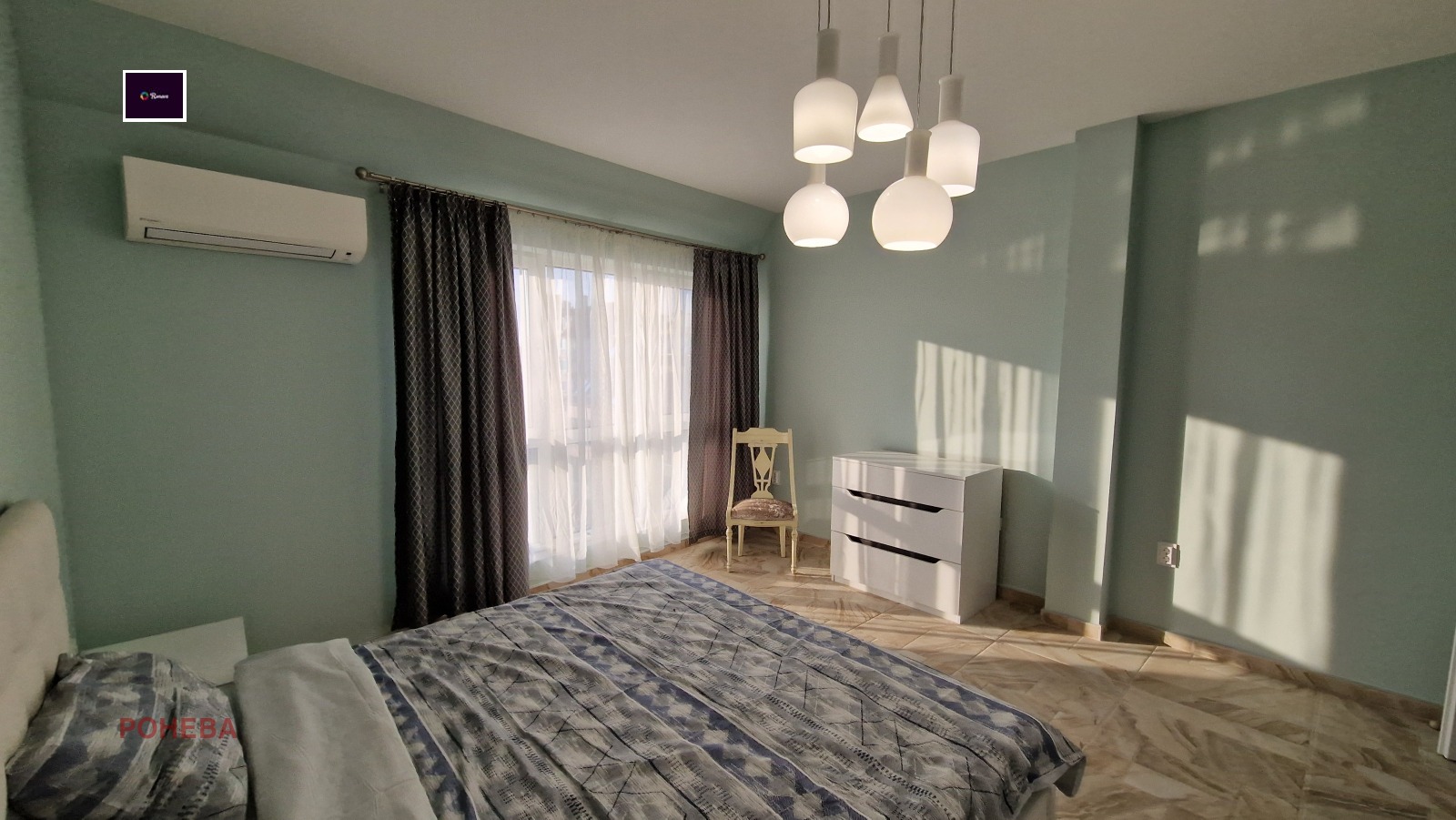 Родителска спалня 23 кв.м обзаведена с Голямо двойно легло Шесткрилен гардероб Тоалетка Климатик ' Дайкин'.