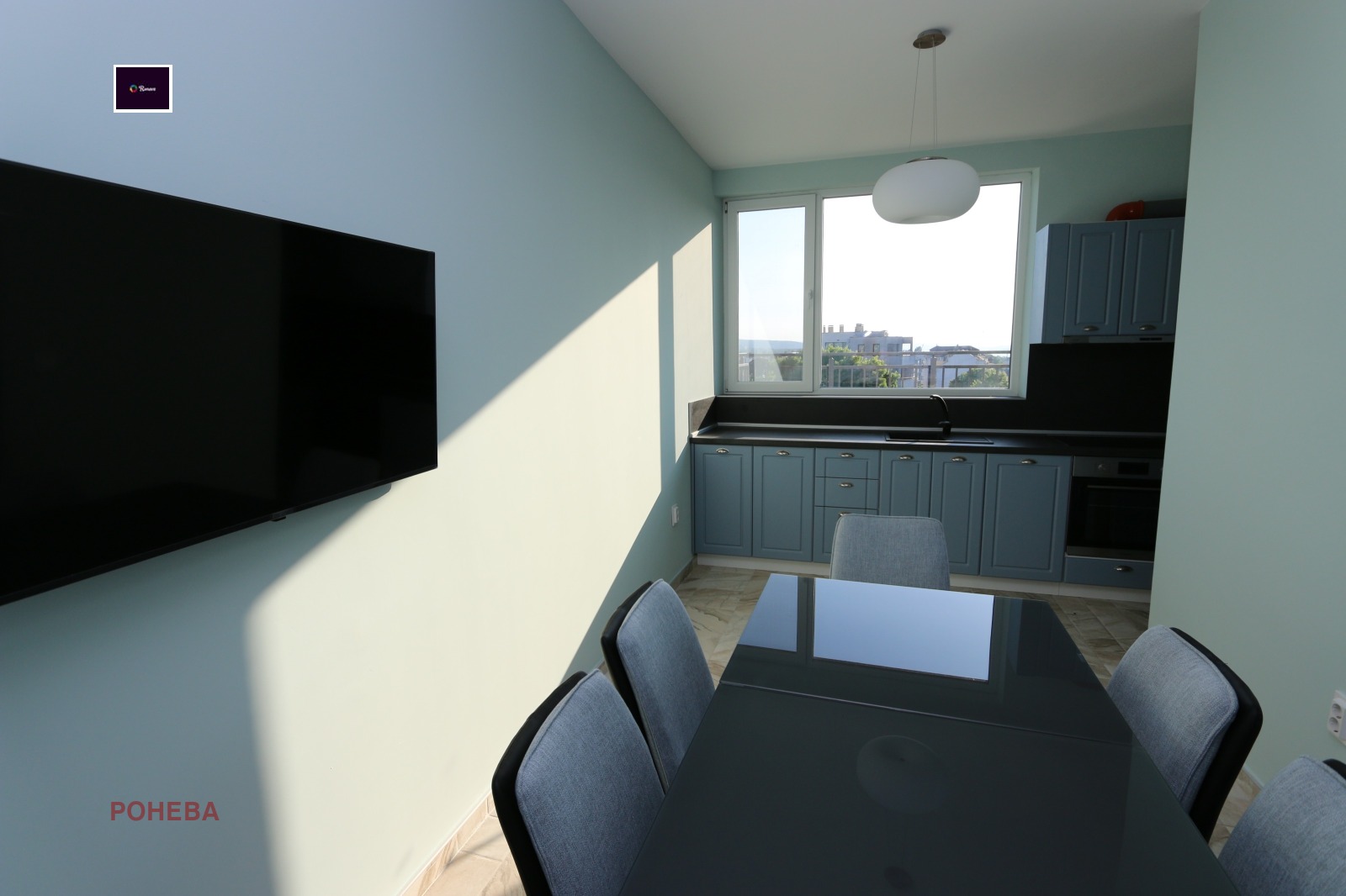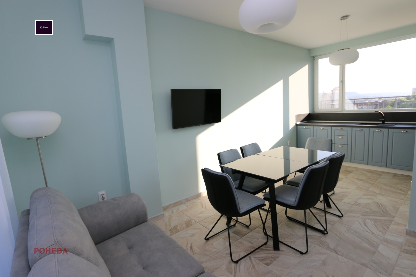 Дневен тракт с вградена кухня със следните електроуреди и мебели: Фурна с керамичен плот Хладилник с фризер Пералня Миялна машина Климатик, Масивна маса за 6 човека със столове Мека мебел , LCD Tv Подова настилка - гранитогрес. Към дневната има санитарен възел и излаз на панорамна тераса 30 кв.м.