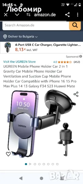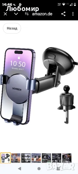 UGREEN Стойка за мобилен телефон Car 2 в 1 Gravity Car Стойка за мобилен телефон Автомобилна вентилация и вендуза Стойка за мобилен телефон Кола Съвместим с iPhone 16 15 Pro Max Plus 14 13 Galaxy F34 S23 Huawei Mate