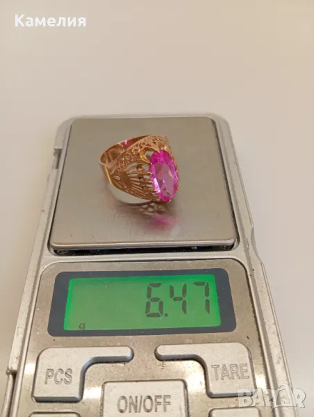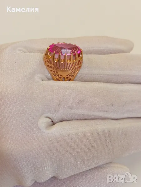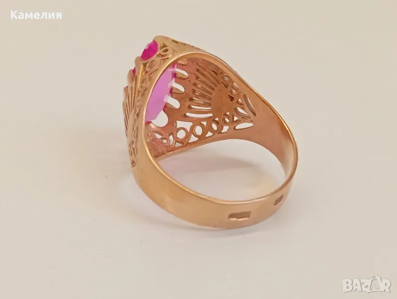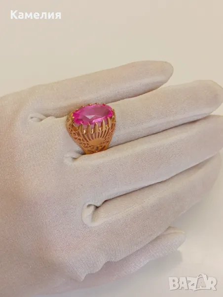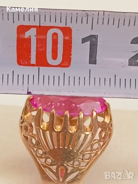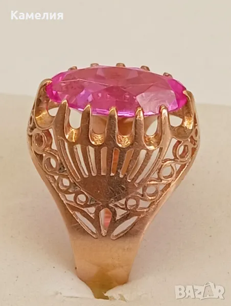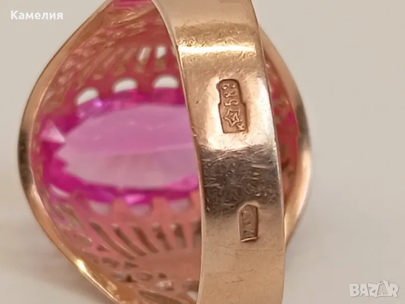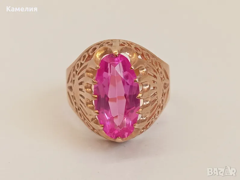 Красив руски ( съветски) златен винтидж масивен пръстен Киевска башня. Проба звезда 583. Грамаж 6,47 грам, диаметър 19,5-20 мм. Камък лабораторен корунд цвят розов.