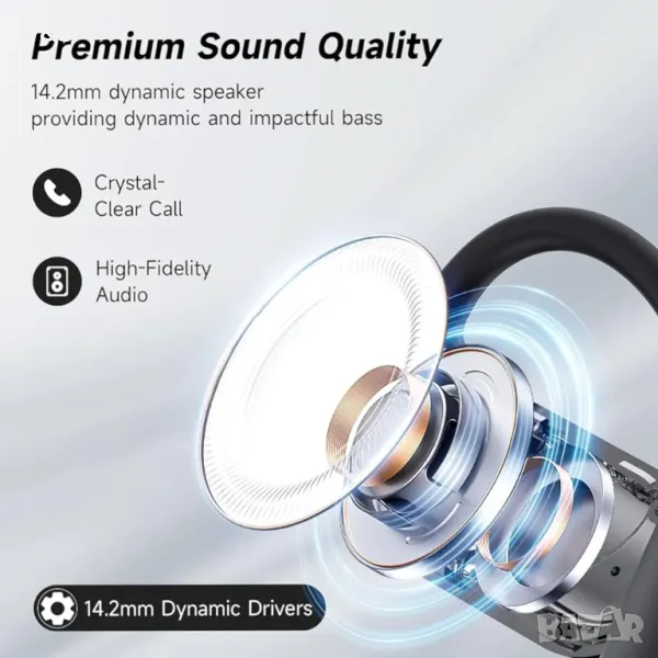 【𝗙𝗲𝗲𝗹 𝗣𝗿𝗲𝗺𝗶𝘂𝗺 𝗦𝗼𝘂𝗻𝗱】Нашите безжични слушалки с отворено ухо решават проблема с изтичането на звук, като ви позволяват да се наслаждавате на аудио от професионален клас, като същевременно защитавате поверителността си. Тези спортни слушалки с отворено ухо имат двойни 14,2 mm въздушни динамични възбудители с ясен звук, мощен звук, стерео звук. Предлага най-доброто изживяване при слушане, независимо дали са чисти и ясни високи или вълнуващо мощни ниски.