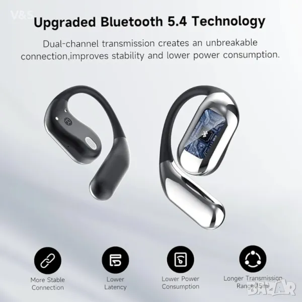 【𝗪𝗶𝗿𝗲𝗹𝗲𝘀𝘀 𝗕𝗹𝘂𝗲𝘁𝗼𝗼𝘁𝗵 𝟱.4】Безжичните Bluetooth слушалки с отворено ухо използват най-новата технология — версията 5.4 Bluetooth. Безжичната връзка Open Ear ви позволява да се отървете от объркването на кабелите; бърза скорост на връзката, стабилен сигнал, за да сте сигурни, че музиката няма да бъде прекъсната, когато тренирате. Обхват на връзката до 33 фута, което поддържа връзка с устройства с Bluetooth, като мобилни телефони, компютри и др.