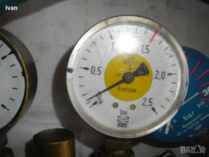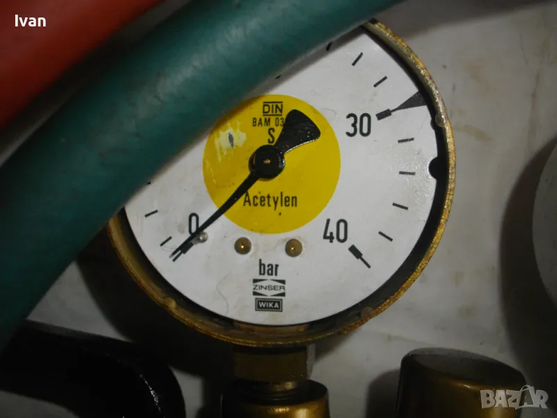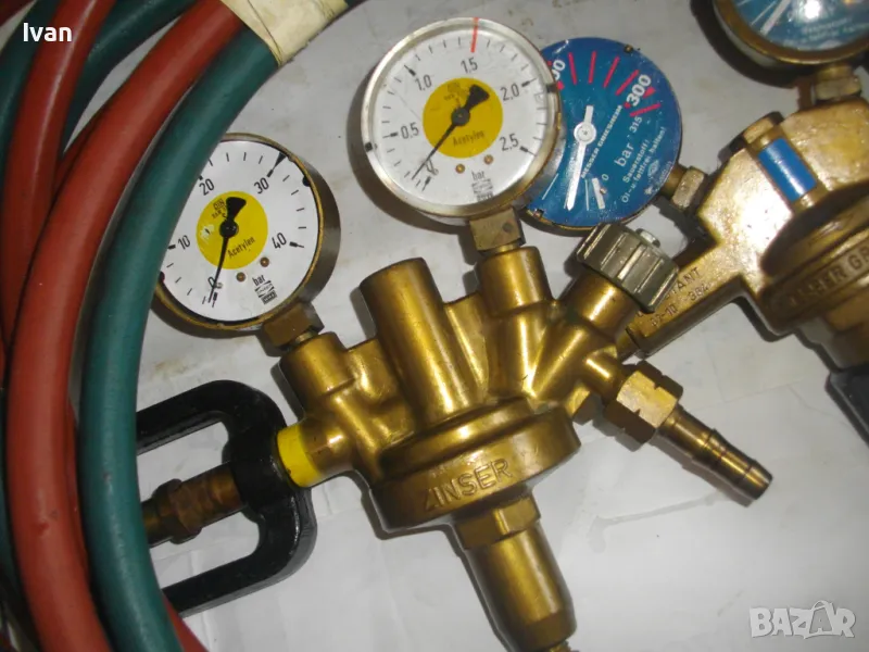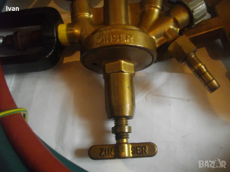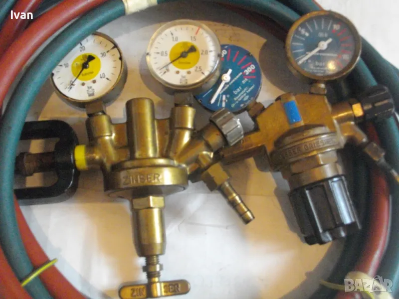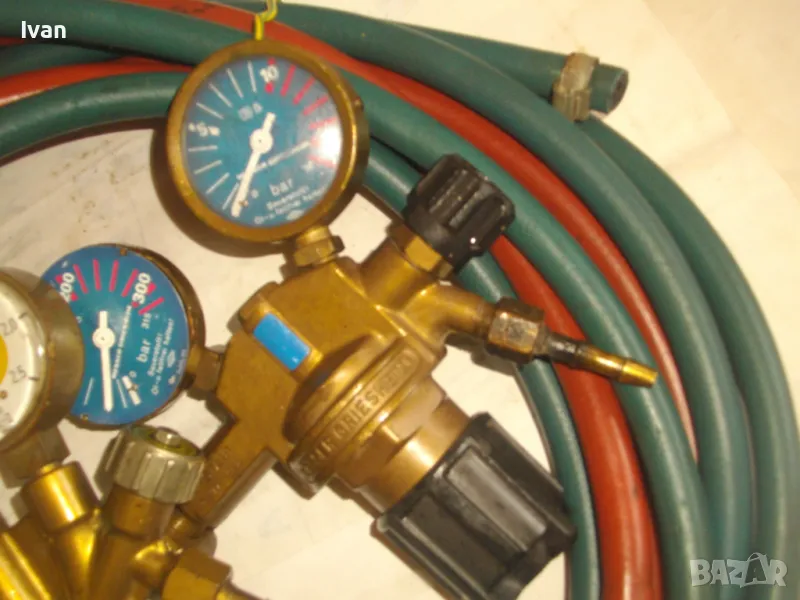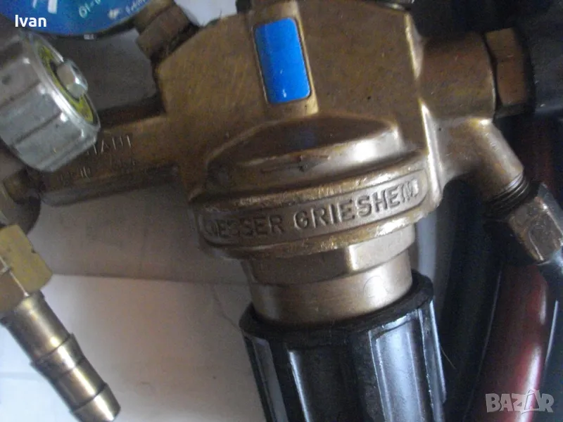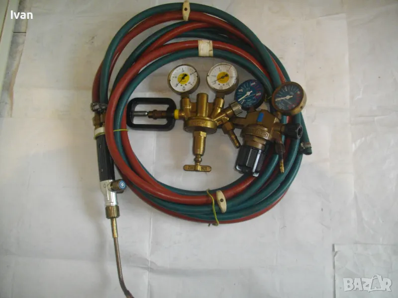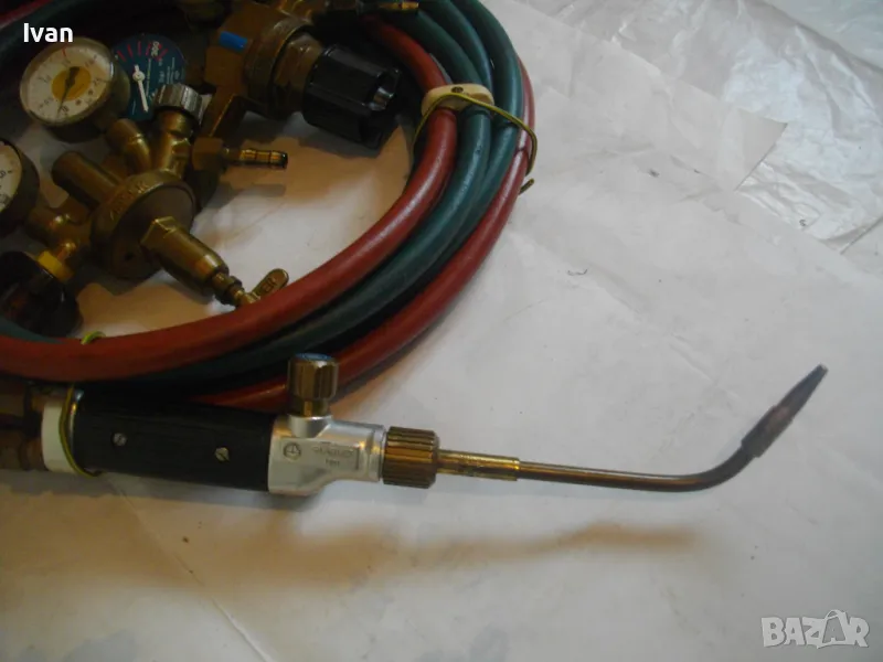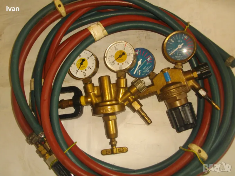 Оксижен Оксиженна ацетиленова горелка Messer Griesheim Starlet 1201 с 2х5 метра оригинални маркучи и 2 оригинални редуцир вентили - цена 499 лв. Горелката е професионална, почти нова ,като нова. Оригинална на Messer Griesheim.Немска или нидерландска. Дължина 39 см, алуминиев корпус с твърдо пластмасово покритие на дръжката, алумин глава, бронзово рамо с медна човка, също оригинални на марката и за модела, 2 спирателни крана бронзови въртоци. Щуцери оригинални бронзови. Маркучи - 2 х 5 метра дължина, отлични, оригинални, без забележки, без никакви напуквания. Редуцир вентил за кислород, оригинален на марката Messer Griesheim, маркиран. Единия манометър е без стъкло, другия е наред. 0-315 бара и 0-16 бара налягане. 2 спирателни масивни крана на вентила. Редуцир вентил за ацетилен - оригинален швейцарски на ZINSER, масивен бронзов, професионален, със скоба за натягане. Също със счупено стъкло на единия манометър. Манометри WIKA 0-40 bar 0-2,5 bar. Спирателен бронзов върток и алумин спирателне кран на вентила. Тегло на комплекта оксижен - всичко - 8,0 кг. Цена на всичко - 599 лв. (306.26 €). Цени на отделни компонентни - по договаряне. Само маркучи не се продават.