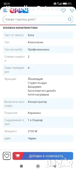 Сешоар Parlux 385 Powerlight, Професионален, Технология с йони и керамично покритие, 2150W, Ниско ниво на шум, 4 настройки на температурата, 2 настройки на скоростта, Черен. Тъй като ми подариха Dyson, се разделям с Parluxa. Много запазен, използван 10тина пъти.