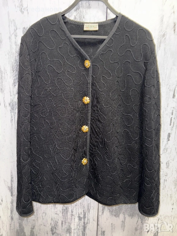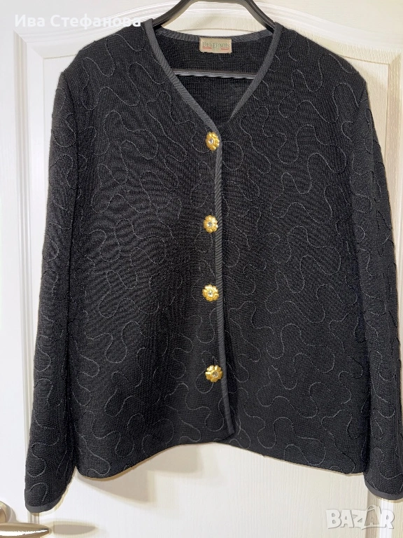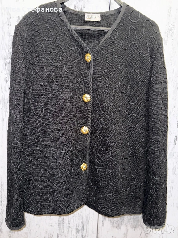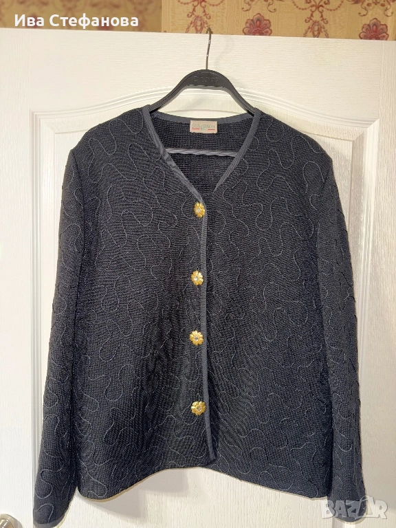 Лукзозно ново сако тип жилетка черно елегантно разкошни копчета атерията е вълнена смес (60% вълна, 40% акрил . Дължина 67 см , бюст 108 см разпъва се поне до 120 см . Произведено във Франция Париж ..Разгледайте и другите ми обяви .