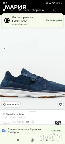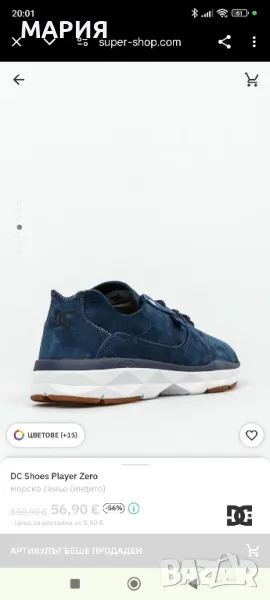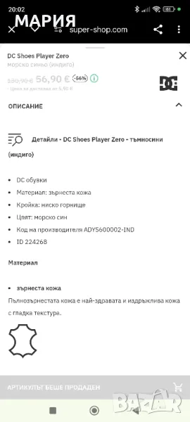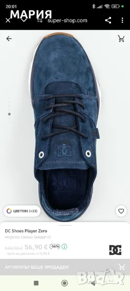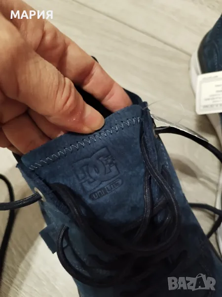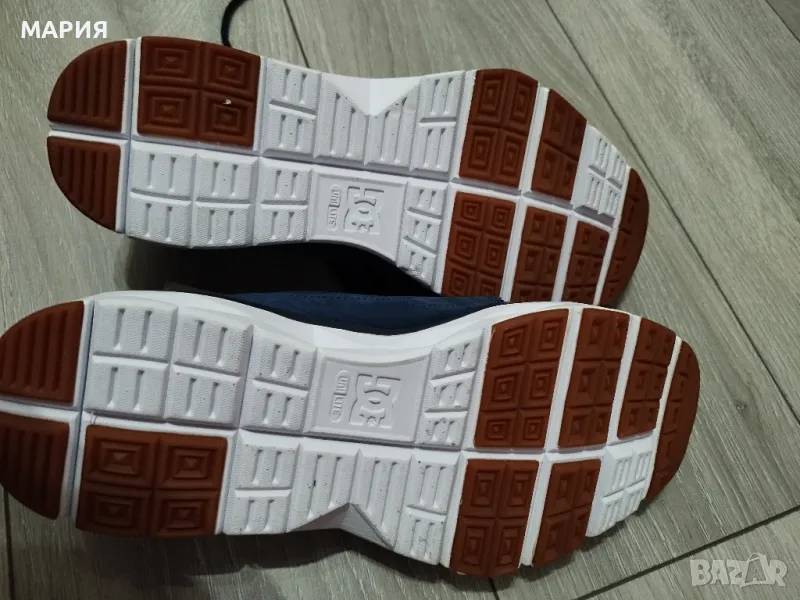 Обувките са на американската марка DC Shoes, цвят индиго, естествена напа, с ортопедични стелки. Абсолютно нови с етикети. Стелка 27см. Поръчахме ги от сайт, но не уцелихме размера.