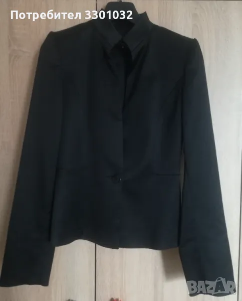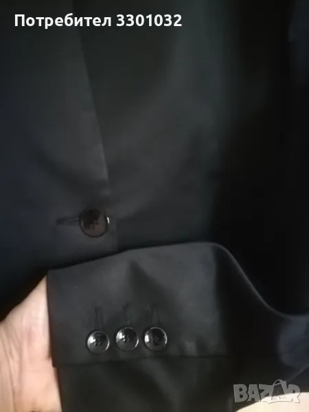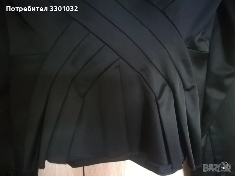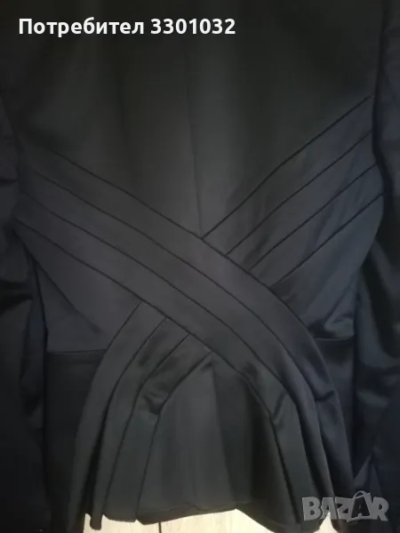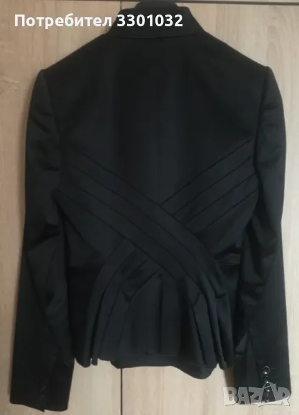 Костюмът е черен с прятен блясък от ацетатните влакна в състава на плата,размер 36.Сакото е вталено,с подчертана талия и много интересен,кокетен гръб.Полата е тип молив с ефектни елементи от талията до ханша /снимка 9/.Състав - 65% ацетат,32% - полиамид,3% - еластан.
