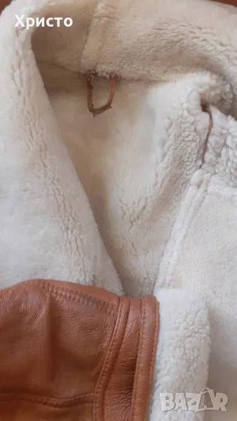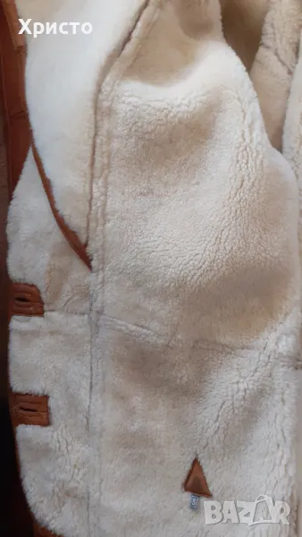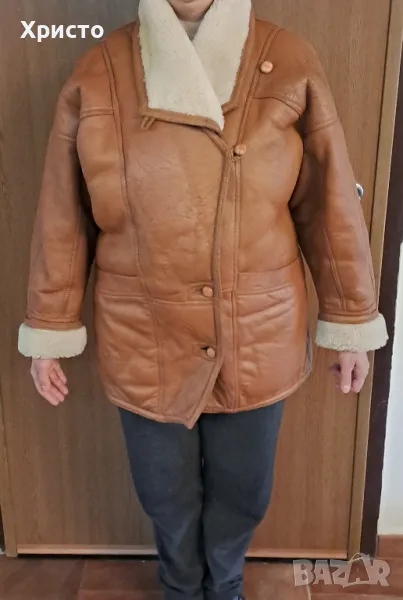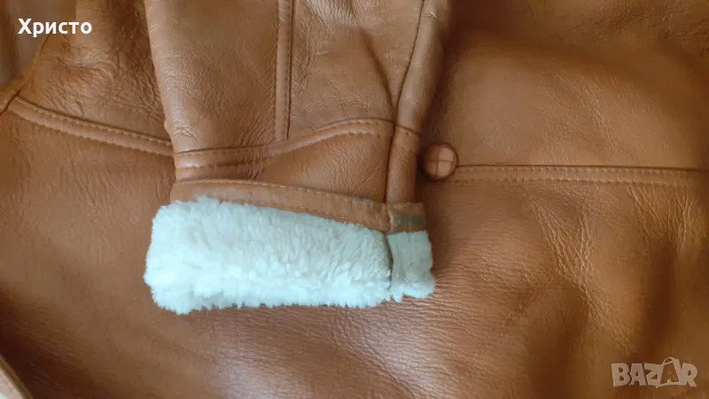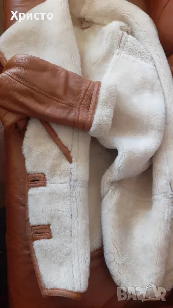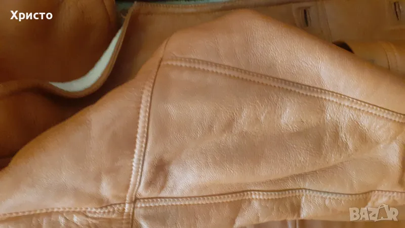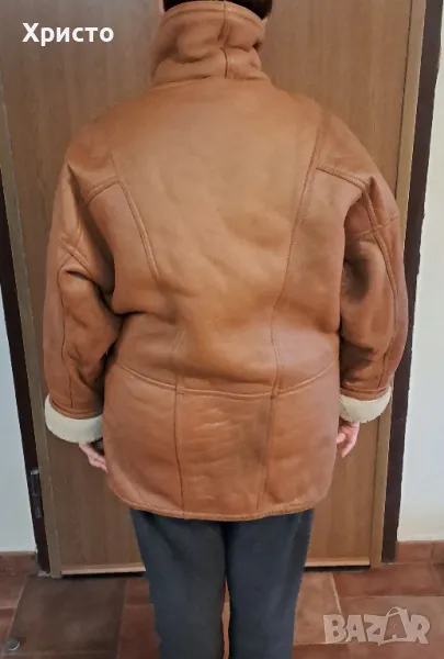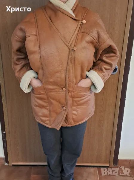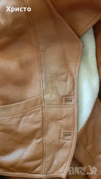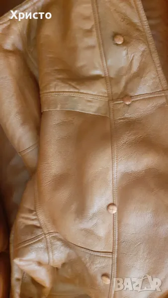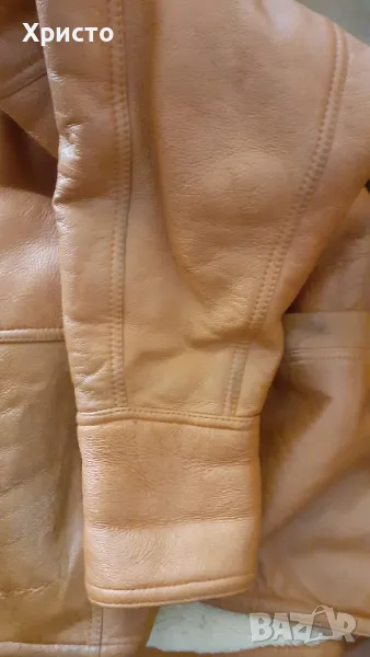 кожа, кафяво. Леко и приятно за носене. Внос преди 15 години от завод в Турция. Изключително топло за най-студените зимни дни и вечери. Има протърквания на места и леки втвърдявания, но няма дупки и като цяло е добро. Цената като ново от завода беше 850 лева. Размер L въпреки, че пише S от вътрешната страна. Има 2 броя външни джоба. Копчетата са налични. Размери: дължина ръкав от края на рамото до долен ръб - 69 см, когато маншета е разгънат и около 60 -58 като се сгъне, разстояние рамена 60 см, разстояние под мишниците, когато е закопчано 60 см, разстояние гръб от яка до долен ръб 77 см. Има и 2 броя подплънки 17х13 см за раменете, които се слагат от вътрешната страна