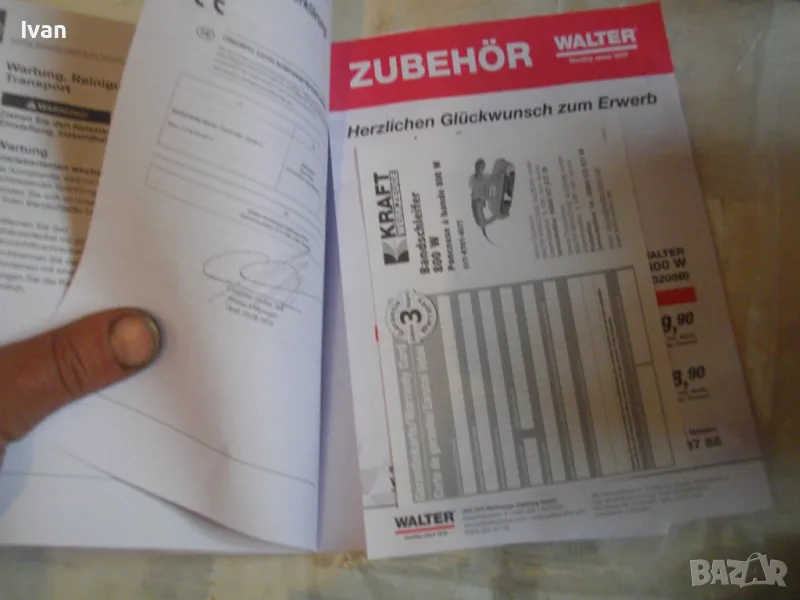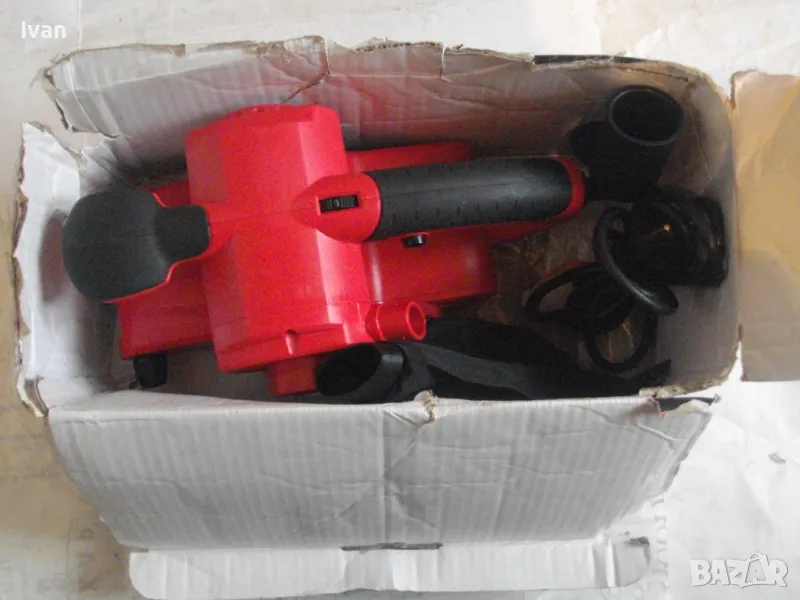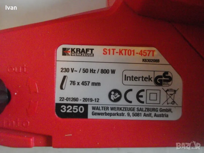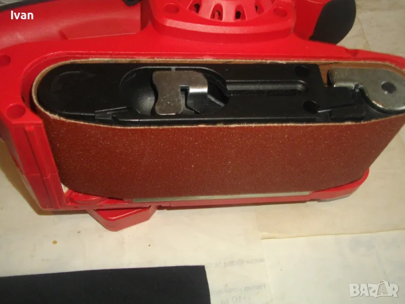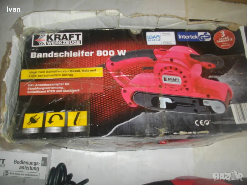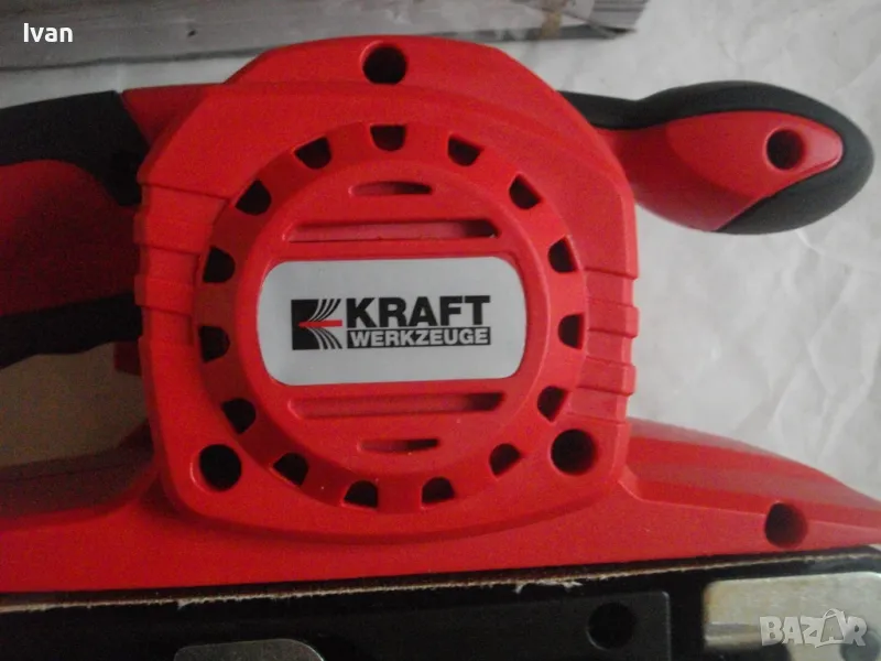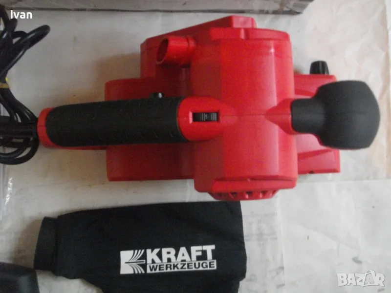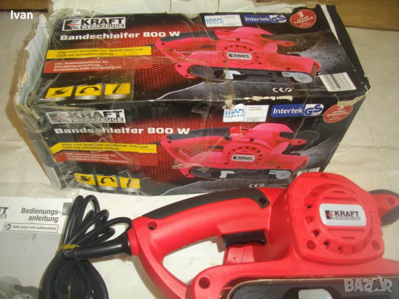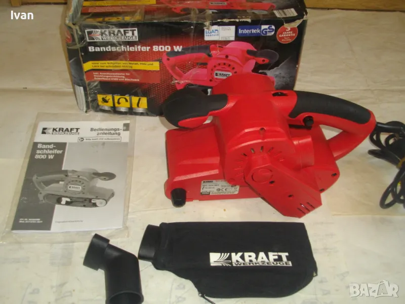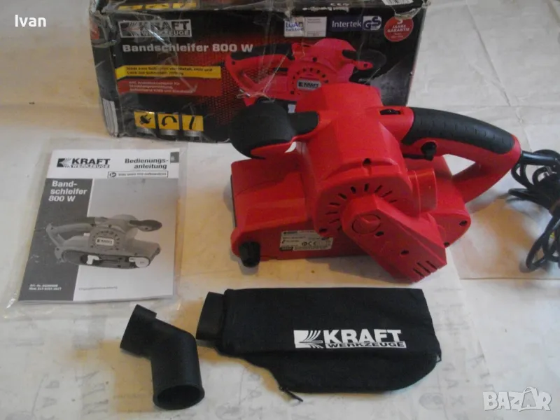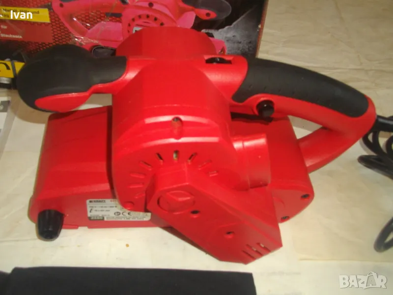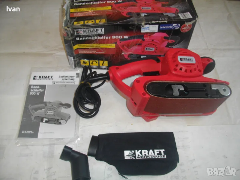 Лентов шлайф НОВ в червен кашон. 800 ватов австрийски оригинален модел. Съвсем нов комплект, неползвани неупотребяван. Професионален. Марка и модел на машината - KRAFT Werkzeuge S1T-KTO1-457T. Производител маркиран -WALTER Werkzeuge - производство маркирано 2019 г. Salzburg - Austria. Мощност на мотора 800 вата, скорост 0-5 м/сек. За шкуркови пояси размер 76 х 457 мм. Регулация на скорост - 6 степени с потенциометър. Гумирани покрития на предна и задна дръжки. Поставена шкурка оригинална на машината. В комплекта е включена оригинална торба за прах, оригинален накрайник за маркуч на прахосмукачка скачване към конектора за прах, техническа документация на машината, оригинален кашон кутия с маркирано оригиналното австрийско производство на него. Размери на кутията 330 х 180 х 170 мм. Тегло на комплекта - 3,5 кг.