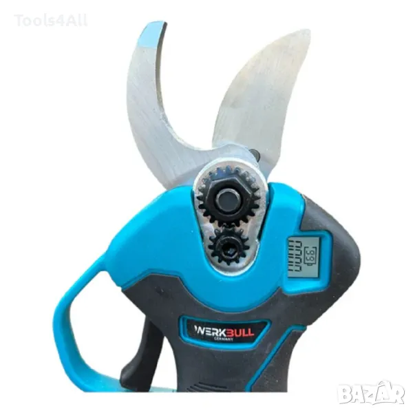 Акумулаторна Лозарска Ножица WERKBULL - перфектна грижа за вашата градина. Този иновативен инструмент ви позволява лесно и ефективно рязане на лозови пръчки, клони и дървета с диаметър до 33 мм. Проектирана с висока скорост на рязане и регулируемо отваряне, ножицата предоставя гладки и прецизни рязове. Наличен дисплей с който да следите нивото на батерията и направените рязове