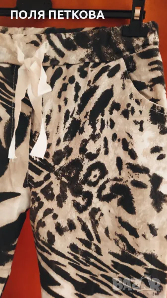 Панталон с модерен ефектен принт нов талията е на ластик и с връзки размер L XL талия от 80 се разтяга до 100 см ханш 100 до 125 дължина 100 см много еластична материя лек и удобен