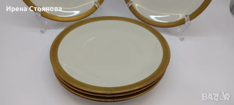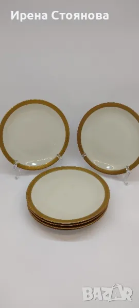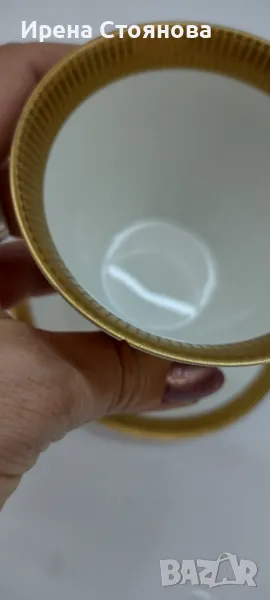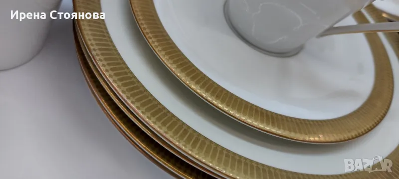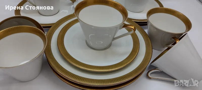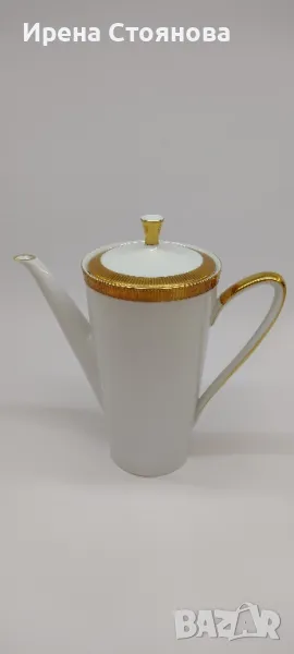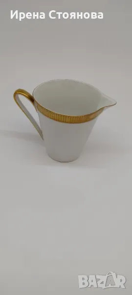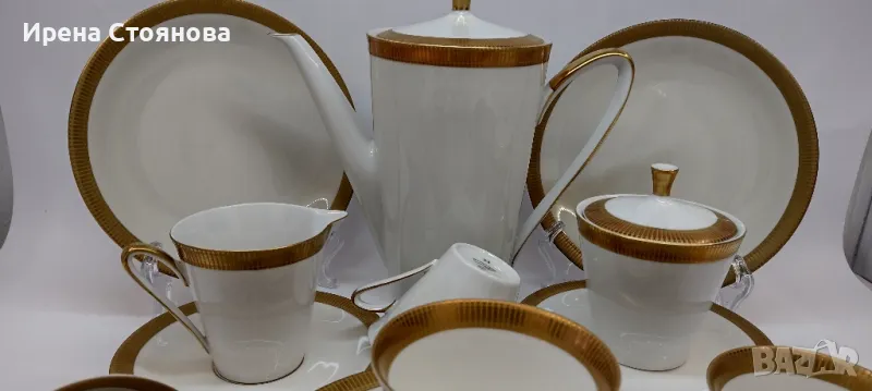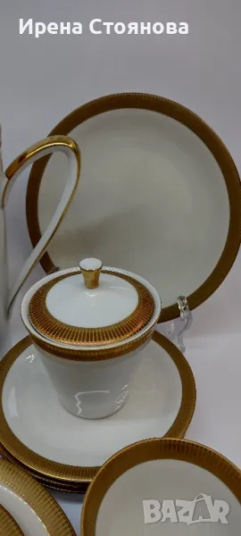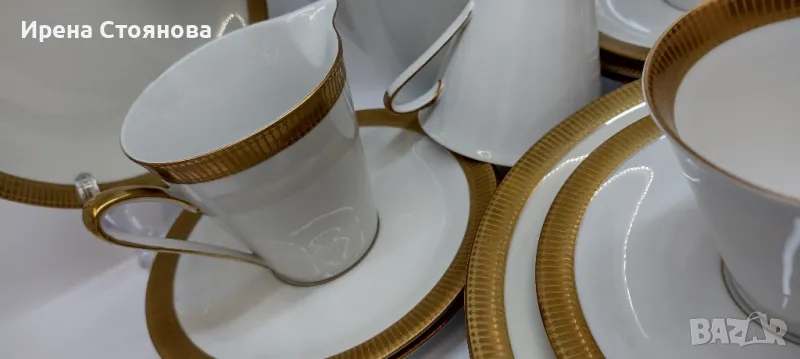 Johann Seltmann Vohenstrauss Bavaria 1949-1955 Изчистен, елегантен фин порцелан с плътен златен борд, лек релеф при допир. 💠Чайник с вместимост 1100 мл, височина с капак 23 см, без 20 см, ширина от дръжка до чучура 23 см. Много леко износване на златен кант от едната страна на дръжката. Цена 45 лв.💠Захарница с вместимост 250 мл, височина с капак 11 см, без 8 см и диаметър 9 см. Минимални следи от употреба/съхранение. Цена 18 лв.💠Каничка за мляко в вместимост 200 мл, височина 8,3 см, ширина 11,5 см. Минимални следи от употреба/съхранение. Цена 15 лв.💠6 броя десертна чиния с диаметър 19,5 см. Минимални следи от употреба, една с малко повече. Цена за брой 10 лв.💠Двоен сет. Чаша с вместимост 200 мл, височина 7 см и диаметър 8,5 см, чинийка 15 см. Минимални следи от употреба/съхранение . Налични 4 двойни сета с минимални следи, цена за сет 15 лв. 2 сета с чипче на чашките, цена за двата 12 лв. При интерес към всичко цена 180 лв.