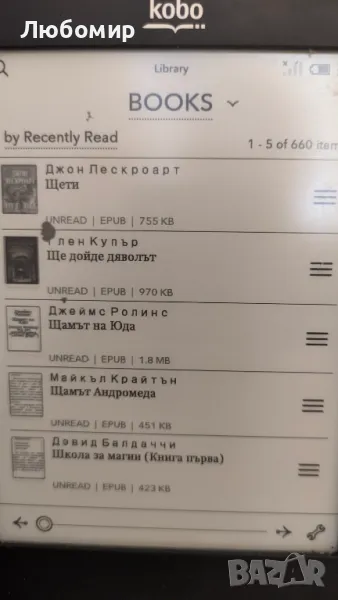 изтощена. Батерията на Kobo Touch издържа до 1 месец с едно зареждане