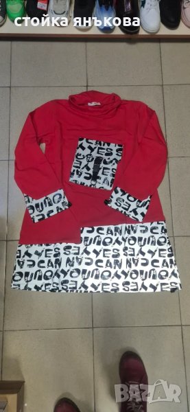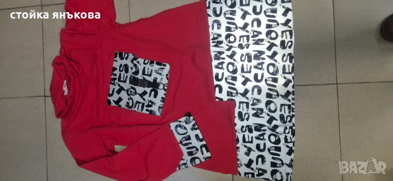 Интересна дамска рокля, може да се ползва и за туника в червено, съчетана с бяло сребристо и черни надписи. Купувана е от Турция за 45 долара.