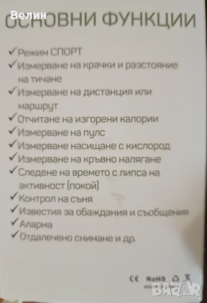 смарт часовник с доста функции , част от които може да се видят на снимката на кутията. зарежда се директно в USB зарядното или USB буксата на компютъра.