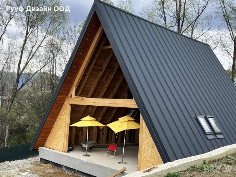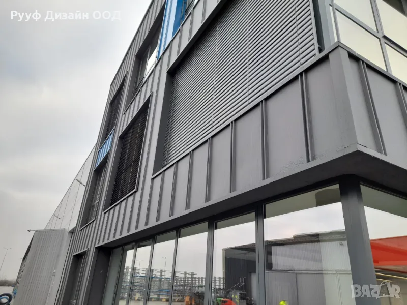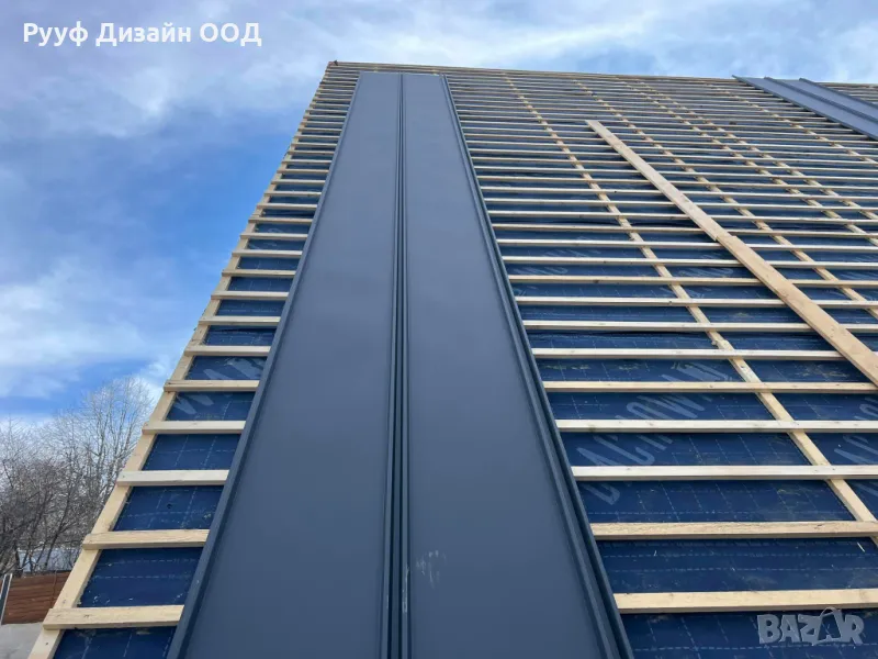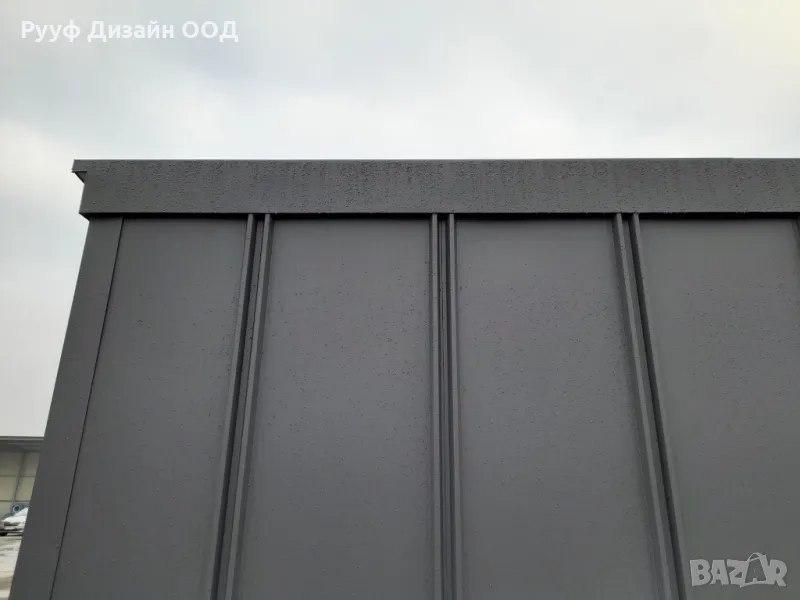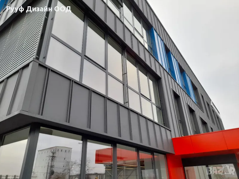 Снимките показват реализация с продукт Т-панел на 3-етажна сграда с МАТ 9005 и МАТ 7016 (къща А-форма). Този продукт е с двойно приложение - подходящ е за покриви и фасади.