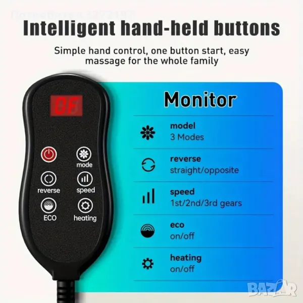 - Предлага се с успокояваща топлинна функция за допълнителен комфорт по време на масажа