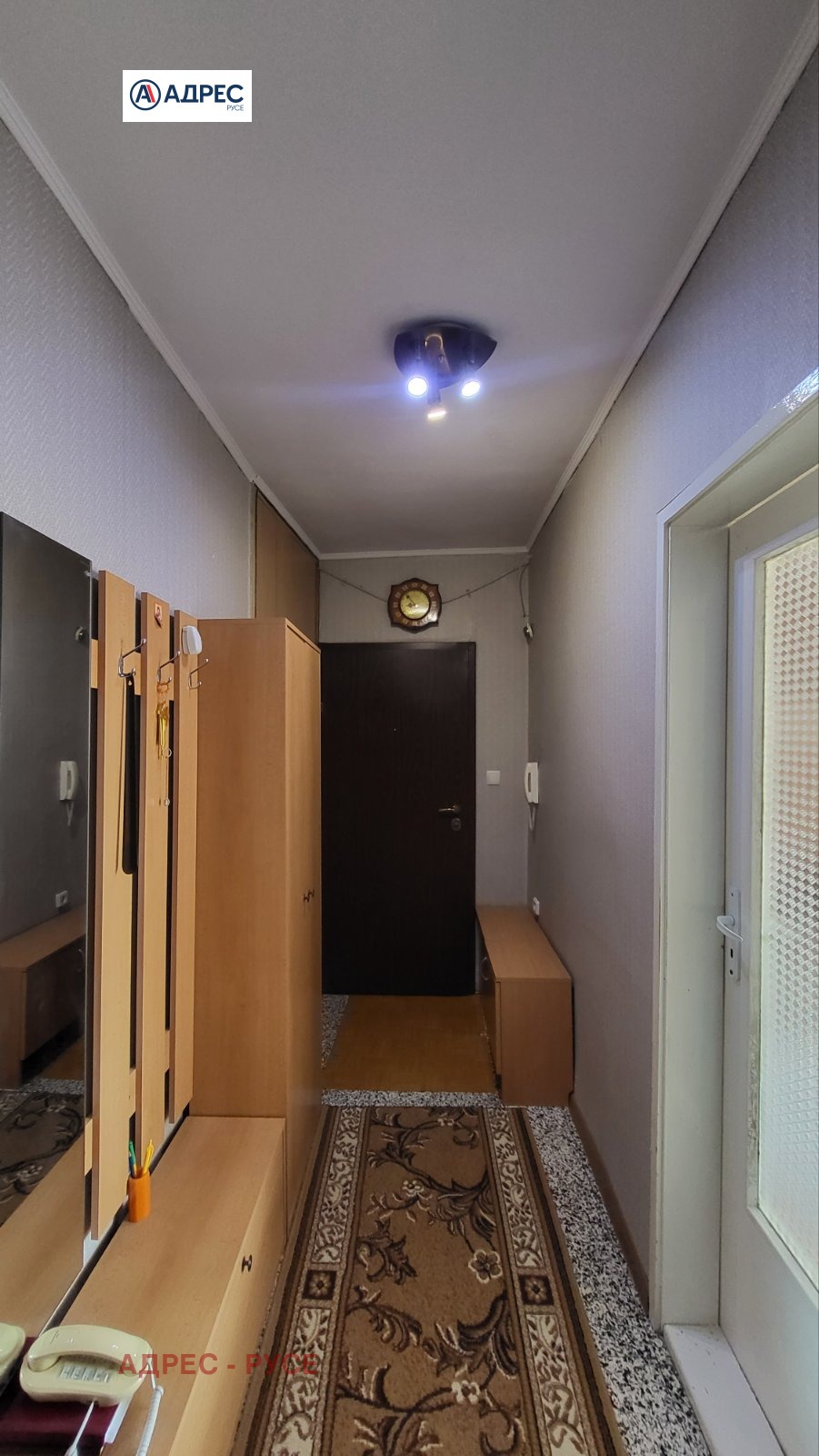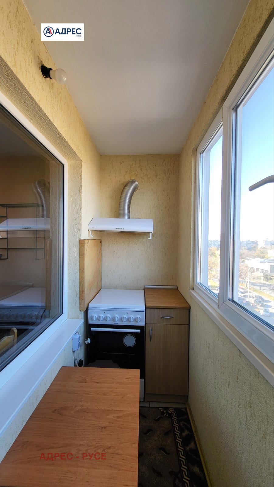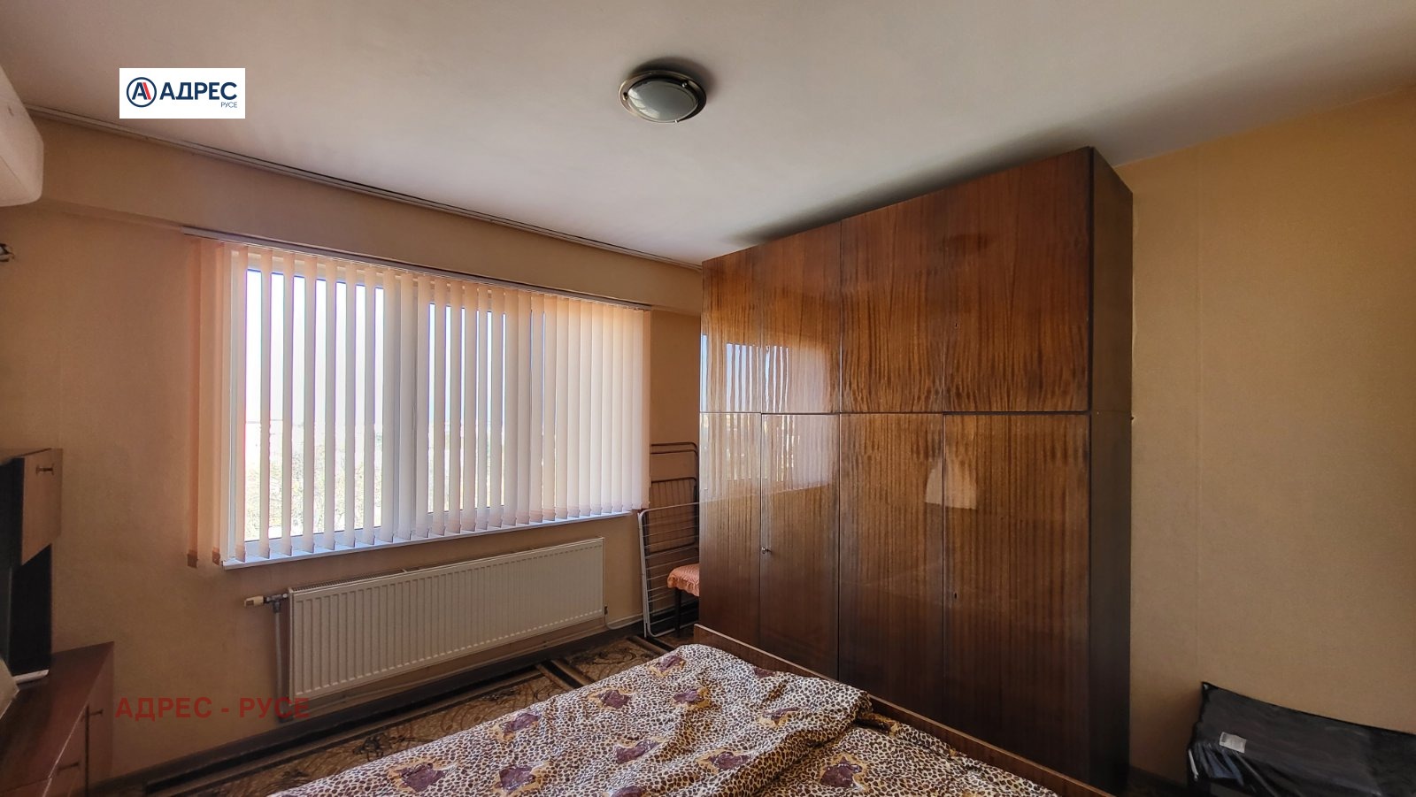 Предлагаме Ви тристаен апартамент с централен ТЕЦ в района на Немската гимназия. Представлява голям коридор, кухня с излаз на закрита тераса, просторен и светъл хол, спалня с излаз на тераса, втора спалня, баня и санитарен възел отделно. Продава се с наличното по снимките обзавеждане и оборудване, два климатика. Жилището е със сменена PVC дограма, изложението е Север-Юг. Паркинг пред блока. За огледи: 0890567890 - офис Адрес Русе