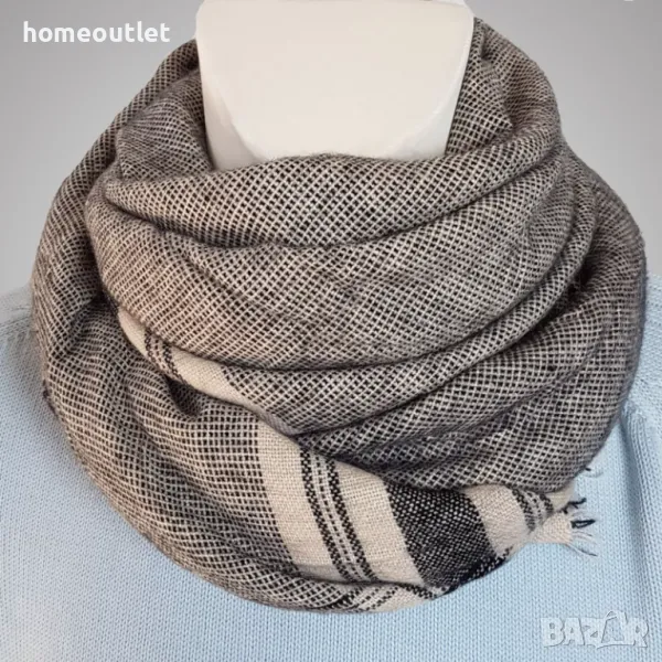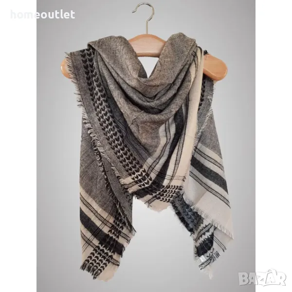 Модерен зимен шал с квадратна форма в класически цветове, които са неутрални и лесни за комбиниране с почти всички нюанси на връхното облекло.