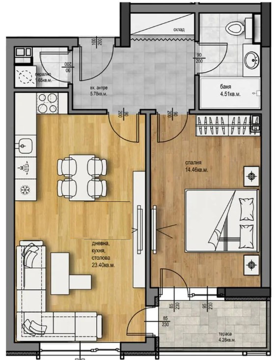 Едно от жилищата, което ви предлагаме е двустайно с изложение: запад и представлява: дневна с кухненски бокс и трапезария - 23,40 кв.м, спалня - 14,46, входно антре, перално помещение, баня с wc и тераса.