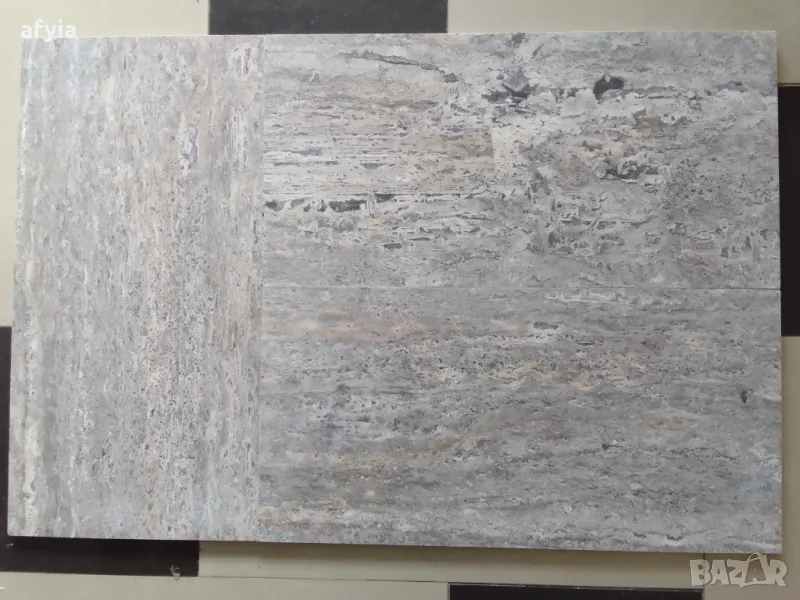 Силвър травертин, рязан надлъжно (по нишката), запълнен, хониран. Гарантирани прави ъгли на плочите.