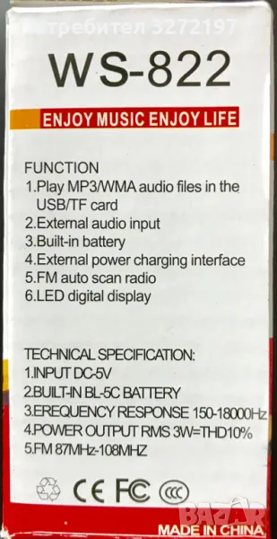 Wster WS-822 преносимо радио, държач за TF / USB карта.