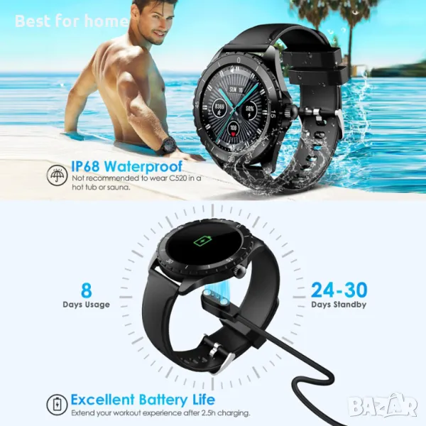 IP68 Водоустойчив : подходящ за къпане при стайна температура (температурата на водата трябва да е под 40 ℃), ежедневна употреба и плуване в плитки води. Не се препоръчва поставянето на C520 в гореща вана или сауна. Тъй като водата с определено качество може да съдържа химически съставки, които могат да повредят часовника, препоръчваме, когато приключите с плуването, да избършете водата от часовника навреме, за да удължите живота на часовника.