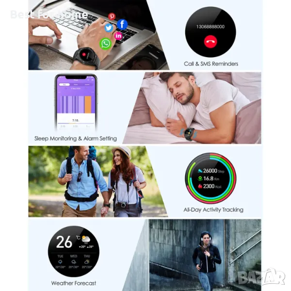 Никога не пропускайте важни съобщения и обаждания : Можете да получавате и четете съобщения или имейли от социални приложения (включително Facebook/Twitter/WhatsApp/Instagram/WeChat и т.н.), дори да затваряте входящите телефонни обаждания директно от китката си. Това е много полезно, ако не ви е удобно да отговаряте на телефона, но не искате да пропуснете важни новини. Активирайте известието в приложението и смарт часовникът ще вибрира при получаване на повикване и ще спре, докато не отговорите на телефонните обаждания.