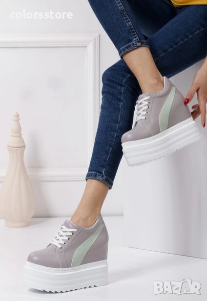 Кецове на платформа - сиви със зелена лента - SJN56