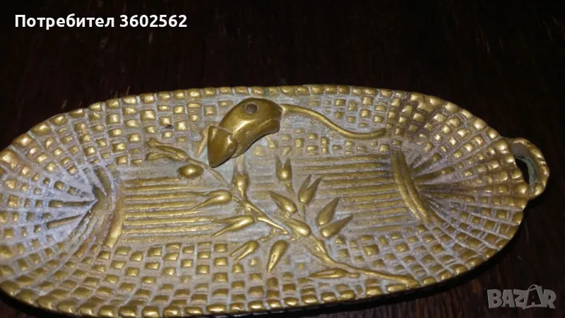 Малко бронзово панерче за дреболии,края на 19 век.Изобразява кошница с овесен клас и мишле което си похапва.Дължина 16см , широчина 6см ,височина 2см.Коментар на цената-възможен
