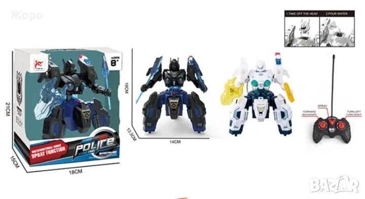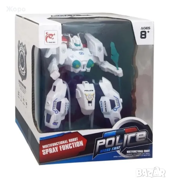 Робот полицай в бяло или черно ,който се трансформира в полицейска кола Светлинни ефекти.
