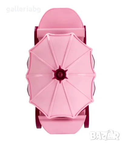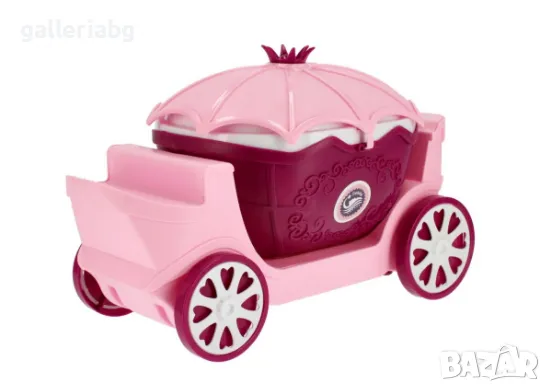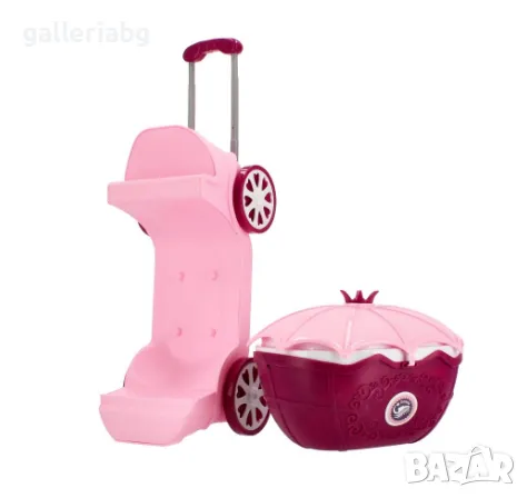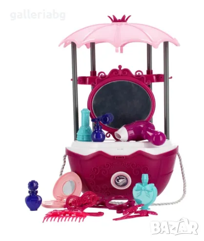 тоалетка под формата на куфар, има колелца за транспортиране, може да се мести и под формата на кошница, за да можете да я вземете със себе си и всичките си любими козметични продукти винаги да са при вас, тоалетка е розово и лилаво, връвта служи за дръжка, има голямо огледало, стимулира въображението на детето.