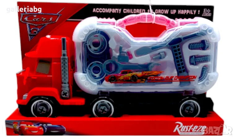 Камионът е с шест гуми. каросерията си вози куфар с инструменти и резервни гуми за смяна. С помощта на гаечния ключ в комплекта, детето може да сменя гумите на камиона.