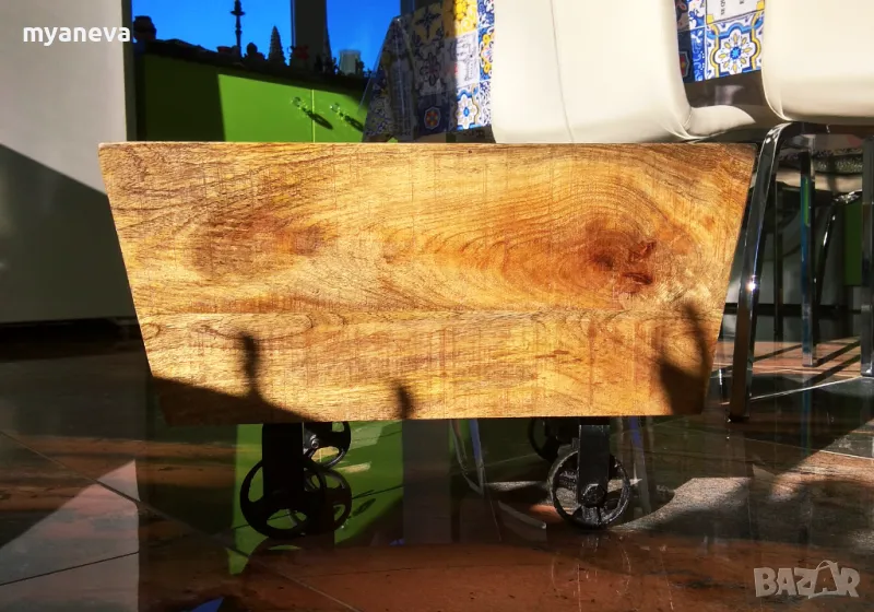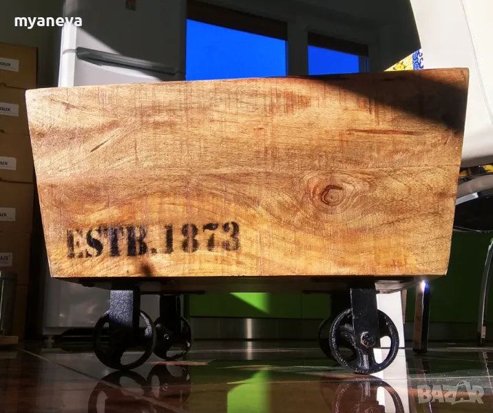 Vintage шкаф от дъб с ръчно ковани колела , за играчки , вино , декорация . → Обява 48105691