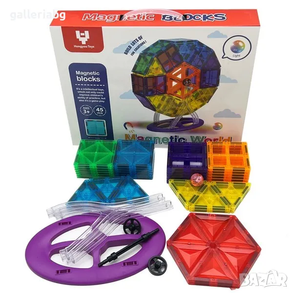 магнитен конструктор от 45 части. Множество възможности за творческо изграждане и развитие на двигателните умения и въображението.