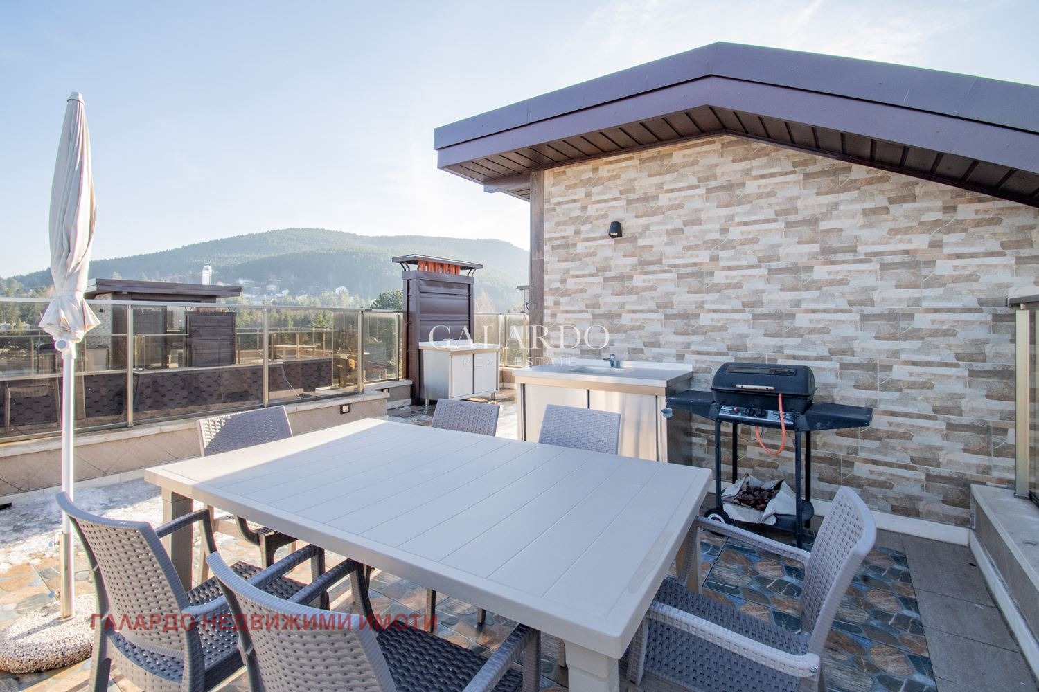 На покрива има панорамна тераса от 62 м2 с барбекю и прекрасна гледка към Витоша, Бистрица и София.