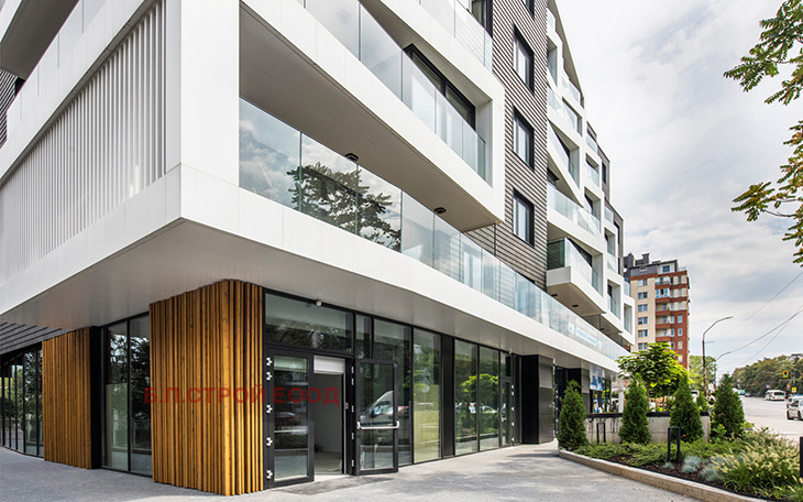 Довършителните работи са изпълнени с висок клас материали, фасадата е окачена с клинкерни плочи и еталбон, алуминиева дограма Reynaers с троен стъклопакет, стъклен парапет и асансьор Tyssenkrupp .